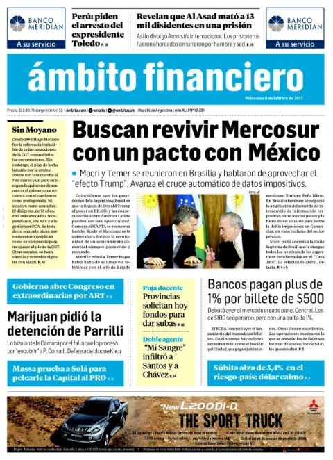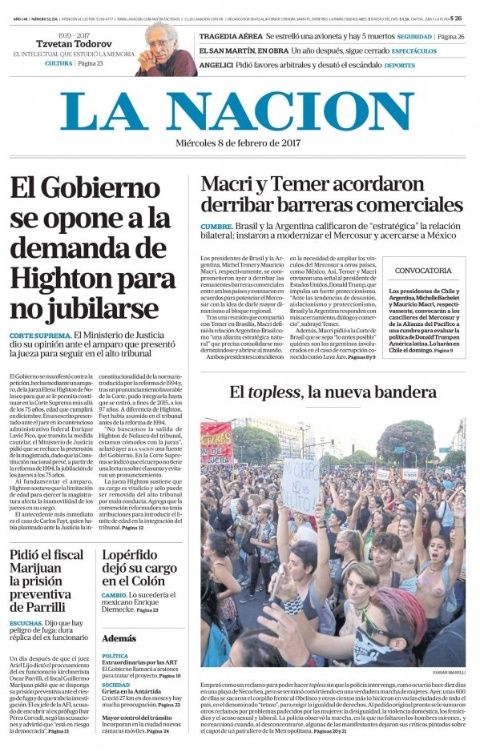 Para que comiences bien informado la mañana del 08/02, te acercamos las noticias más importantes que destacaron en sus portadas los principales diarios de la Argentina: Controles para monotributistas, tetazo en el Obelisco, Atlético de Tucumán venció en Ecuador, Macri y Temer buscan revitalizar el Mercosur y Darío Lopérfido deja su cargo en el Teatro Colón.